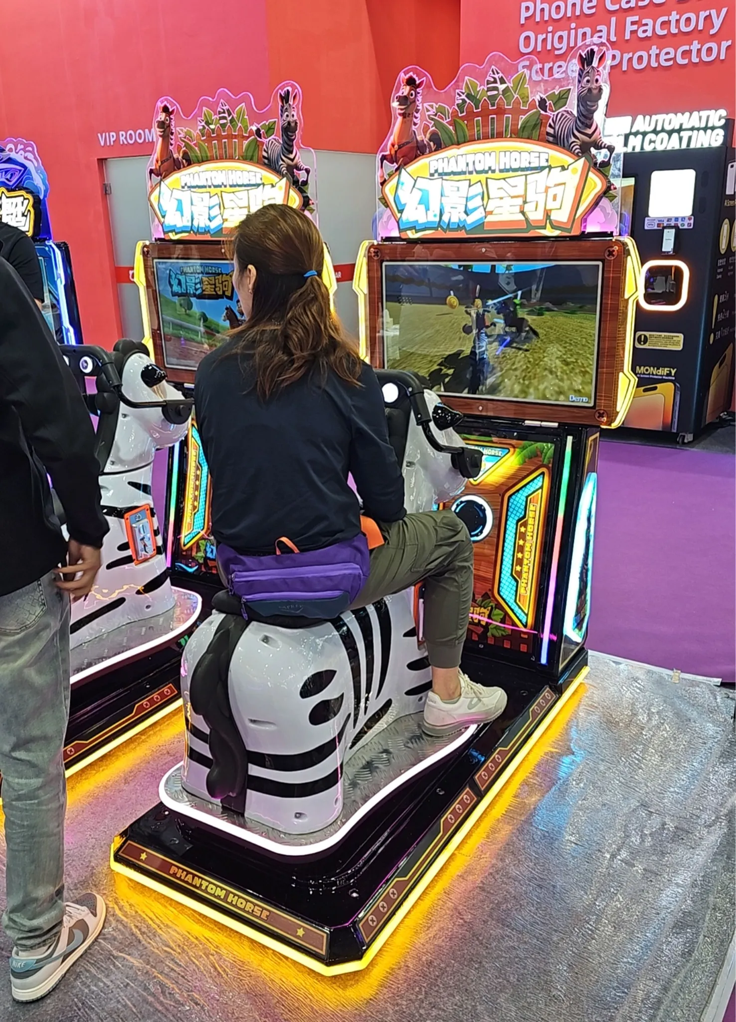 Видео гоночный симулятор на зебре «Phantom Speed Ride» - захватывающий аттракцион, имитирующий верховую езду на виртуальной лошади в формате приключенческого раша. Установленный в развлекательных зонах, он предлагает игрокам сесть на стильную фигурку лошади или зебры, и отправиться в виртуальный забег по красочным трассам, меняя направление рулем и регулируя скорость нажатием педалей.
