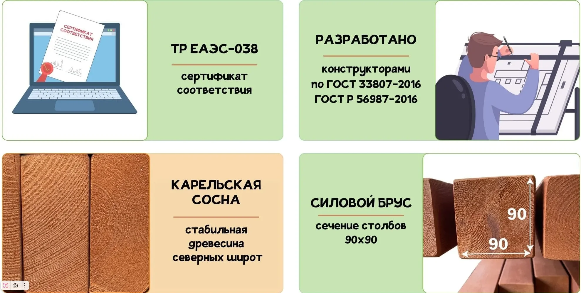 - Обработка дерева: Лакокрасочным покрытием Sherwin-Williams (Шервин-Вильямс) с разрешающим сертификатом для покрытия детских игровых площадок