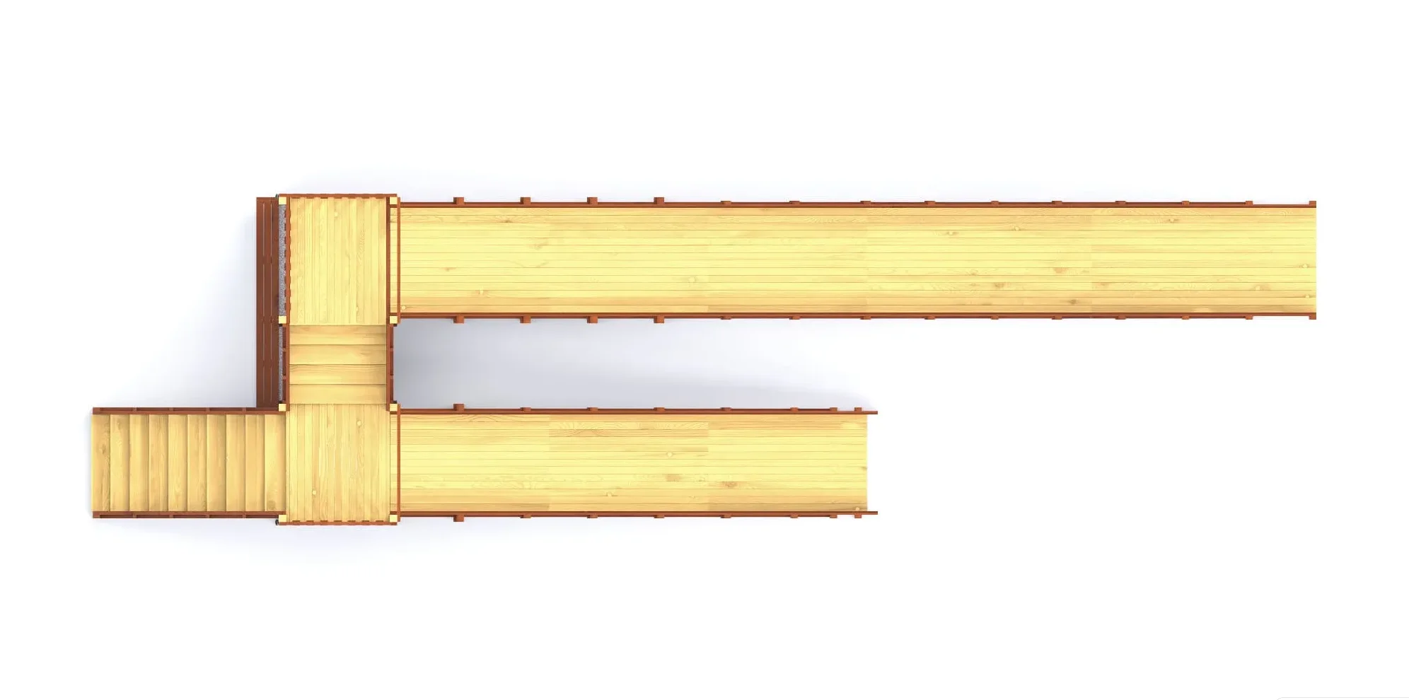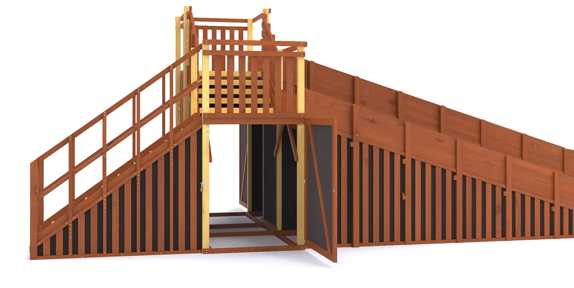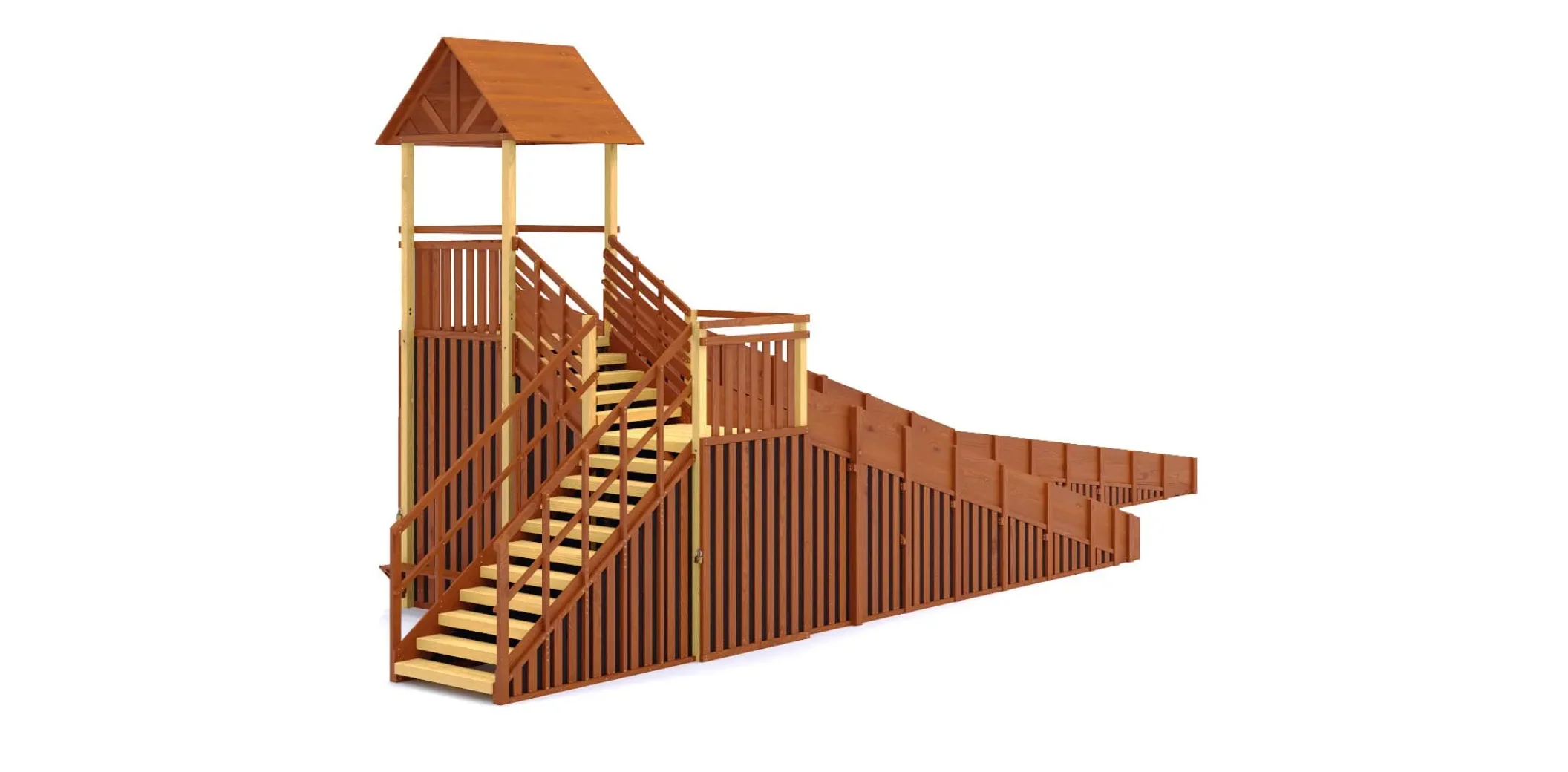 Горка изготовлена из карельской хвойной сосны — плотной северной древесины, экологичной и устойчивой к морозам. Все элементы проходят камерную сушку и обработку покрытием Sherwin-Williams, разрешённым для детских площадок.