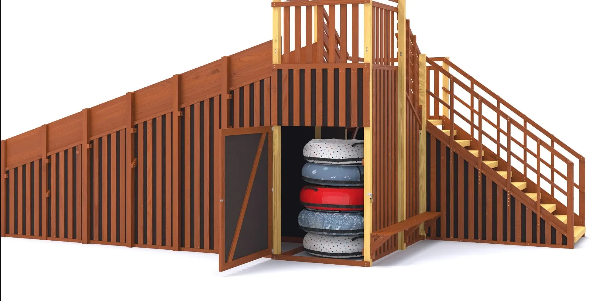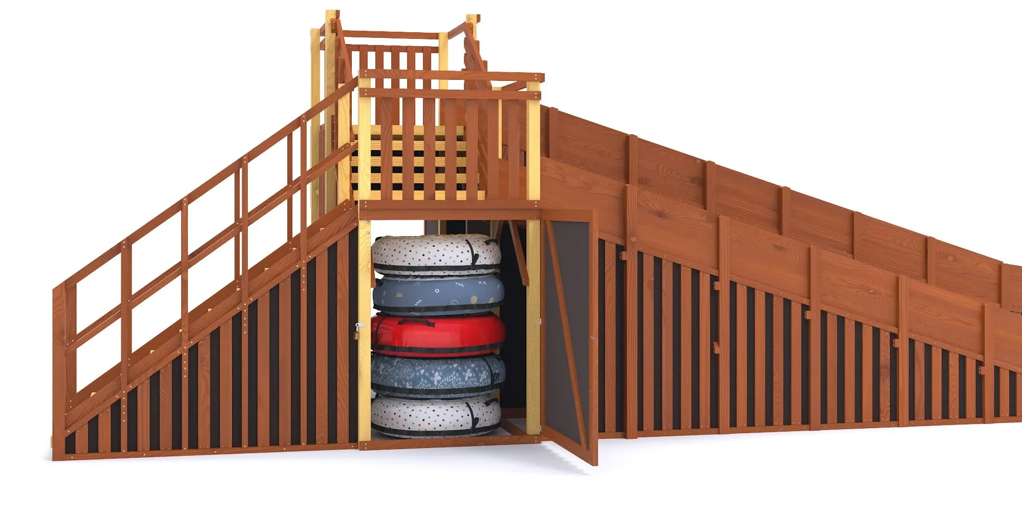 Под платформой расположен закрытый отсек для хранения тюбингов — функциональное решение, защищающее инвентарь от снега. Отсек закрывается замком, который входит в комплект. Дополнительно установлена комфортная лавочка.